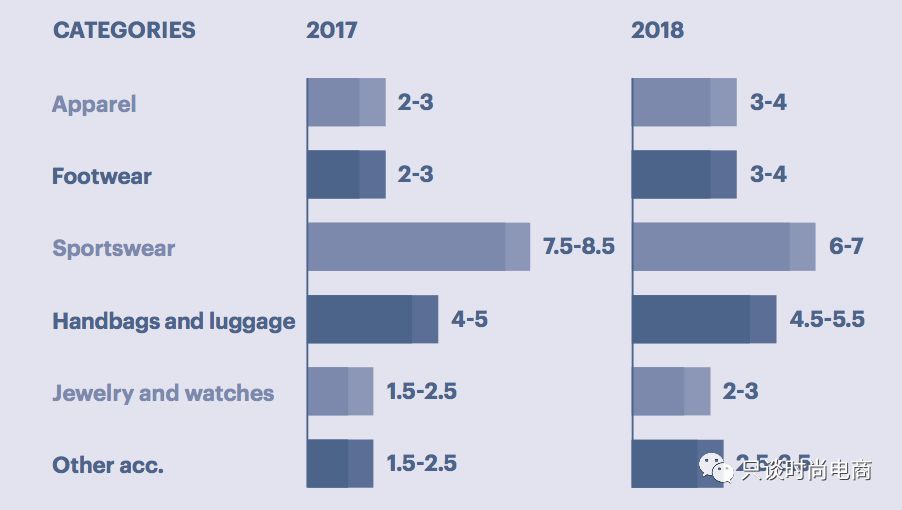 下图,按照产品类别来看,运动时尚一枝独秀,增长高达8%;在2017-2018年也继续领跑。紧跟其后的是箱包品类。而成衣、鞋履、珠宝、手表的日子最难过。