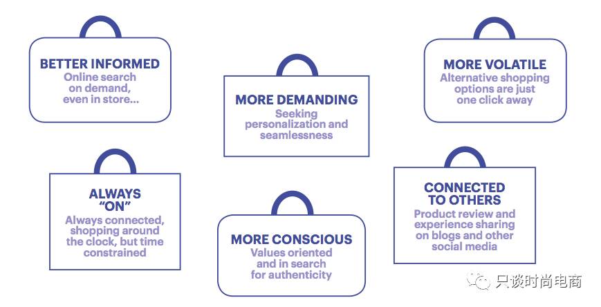 顾客时刻连线(always on),自认为是“地球公民”。需求更多变,视野更广阔。因为能接触到海量信息,她/他更加关注商品的真正价值。可能把不同的品牌和设计师的商品混搭,以满足个性需求。年轻一代异常钟情表达自我,他们在网上各种晒。时尚也只是他们表达自我的工具。