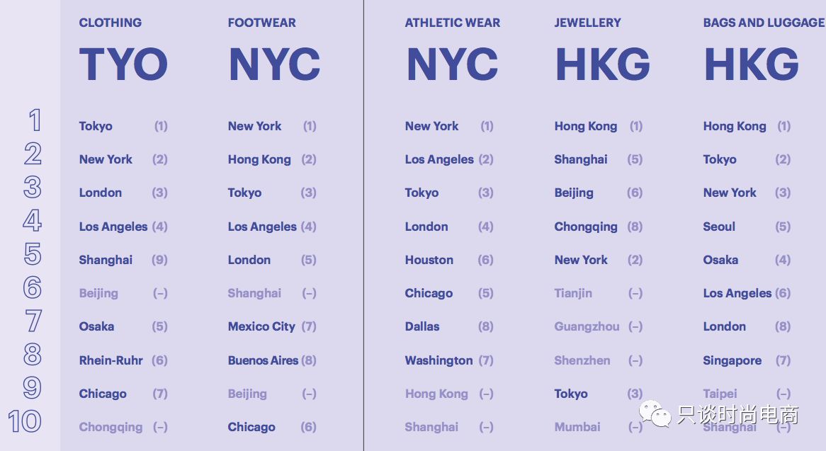 在运动服饰、箱包排名最靠后,而且只有上海入围。