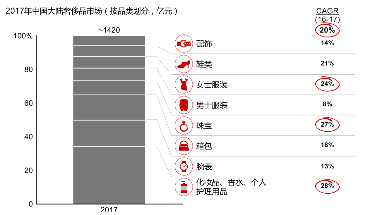 尽管2017年奢侈品市场回暖,但各类时尚奢侈品牌在这一年内业绩表现参差不齐,平均国内市场增长率为20%。