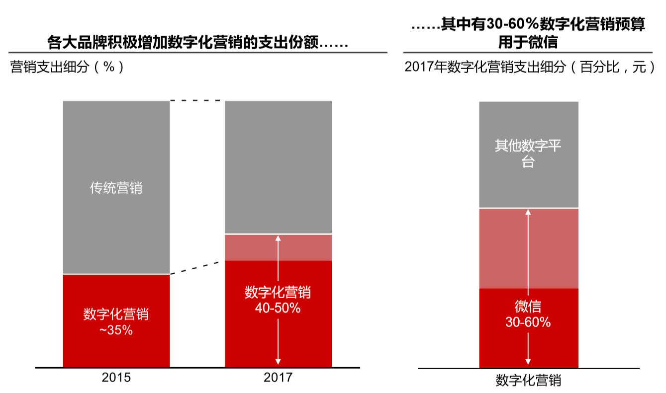 其中能够占领先机的优势品牌大都具有几点共性,首先从设计入手,不断对传统元素进行翻新,向品牌注入创新设计,并在设计细节上迎合消费者对“个人主义”的青睐;更重要的是品牌对数字化营销的投资,利用各大社交平台,传达不同的价值主张,研究发现全球40大奢侈品品牌都推出了自己的微信公众号,品牌数字营销的支出份额由2015年的不到35%上升到了40%至50%,而这其中的30%到60%预算均用于微信,同时,在微信上进行推广活动的奢侈品牌数量较2015年翻了十倍。