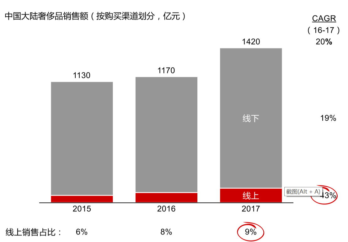 千禧一代的行为是市场运作结果,同时也是起因,报告显示,线上渠道的奢侈品销售额持续保持高速增长态势,增速快于国内市场整体增速,但整体销售占比依然较低,大约9%。相对于化妆品类在线上的渗透率能够达到15%至20%,整体奢侈品线上渗透率依然处于低位。