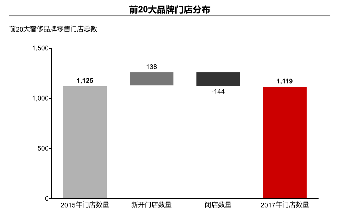 越来越多的奢侈品品牌更加注重线上渠道,推出了自己的官方商城网站,或者计划在2018年推出。此外,大多数品牌继续调整自己的线下布局,在排名前二十的大品牌中,超过半数都对自己的门店网络进行了整合,减少了门店数量,但扩大了单店面积。统计数据中,2015年前二十品牌总计门店数量为1125家,2017年为1119家,几乎没有变化,正是因为品牌都采取了“关小店、开大店”的策略。部分门店坐落于多功能大型购物中心,希望为消费者提供“购物、娱乐、休闲一站式综合购物服务体验”。门店生产效率的提升推动线下渠道取得稳定增长。