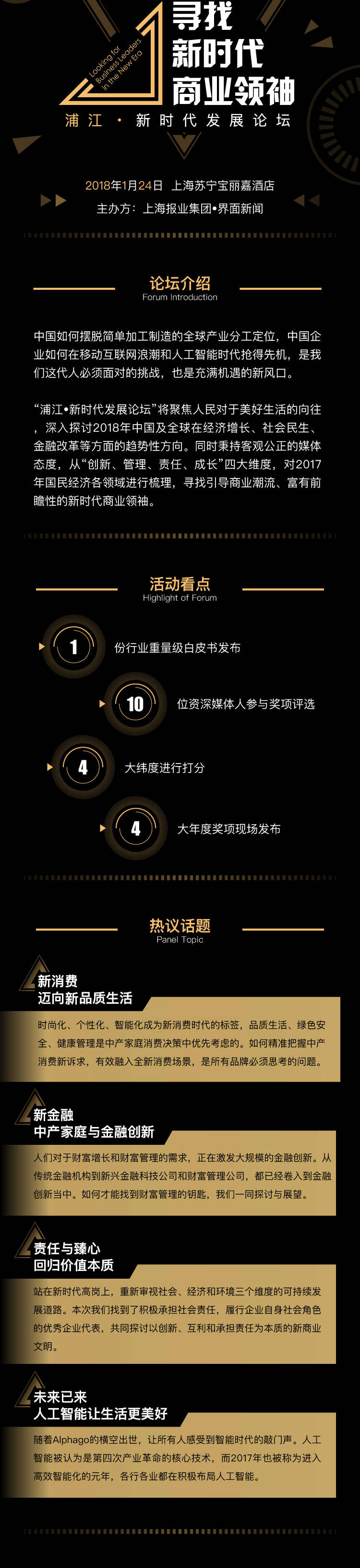 2018年1月24日,由上海报业集团•界面新闻主办的“浦江•新时代发展论坛”将于上海举行,邀请学者、企业家、媒体人、创业者齐聚一堂,深入探讨2018年中国在经济增长、社会民生、金融改革等方面的趋势性方向,共同为中国高质量发展献计献策。