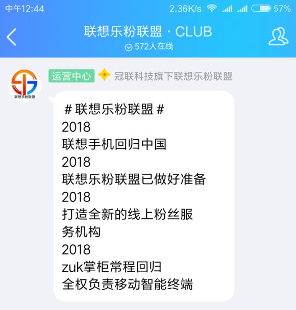 也就是在Lenovo K320t发布当天,ZUK贴吧内有一12级元老发帖,在一名为“联想乐粉联盟CLUB”的聊天群内,疑似官方账号发布了一则“2018,联想手机回归中国”的通知,并且还提到“ZUK掌柜常程回归,全权负责移动智能终端”,甚至还附有欢迎常程回归的海报。