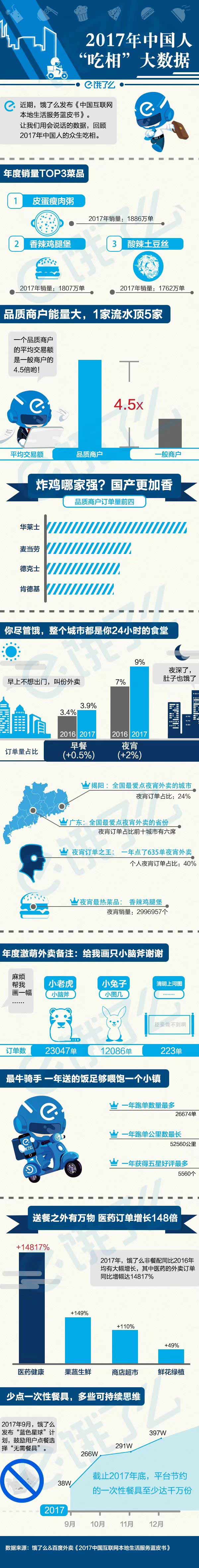 数据显示,2017年,饿了么年度销量TOP 3的菜品分别是:皮蛋瘦肉粥、香辣鸡腿堡和酸辣土豆丝。