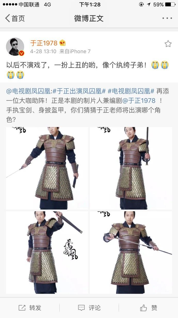 在去年的4月28日,于正转发微博并调侃自己扮相太丑,像个纨绔子弟:“以后不演戏了!”在这张官方定妆照上,于正手执宝剑、身披盔甲,但具体饰演侍卫还是将军,目前还无法得知。
