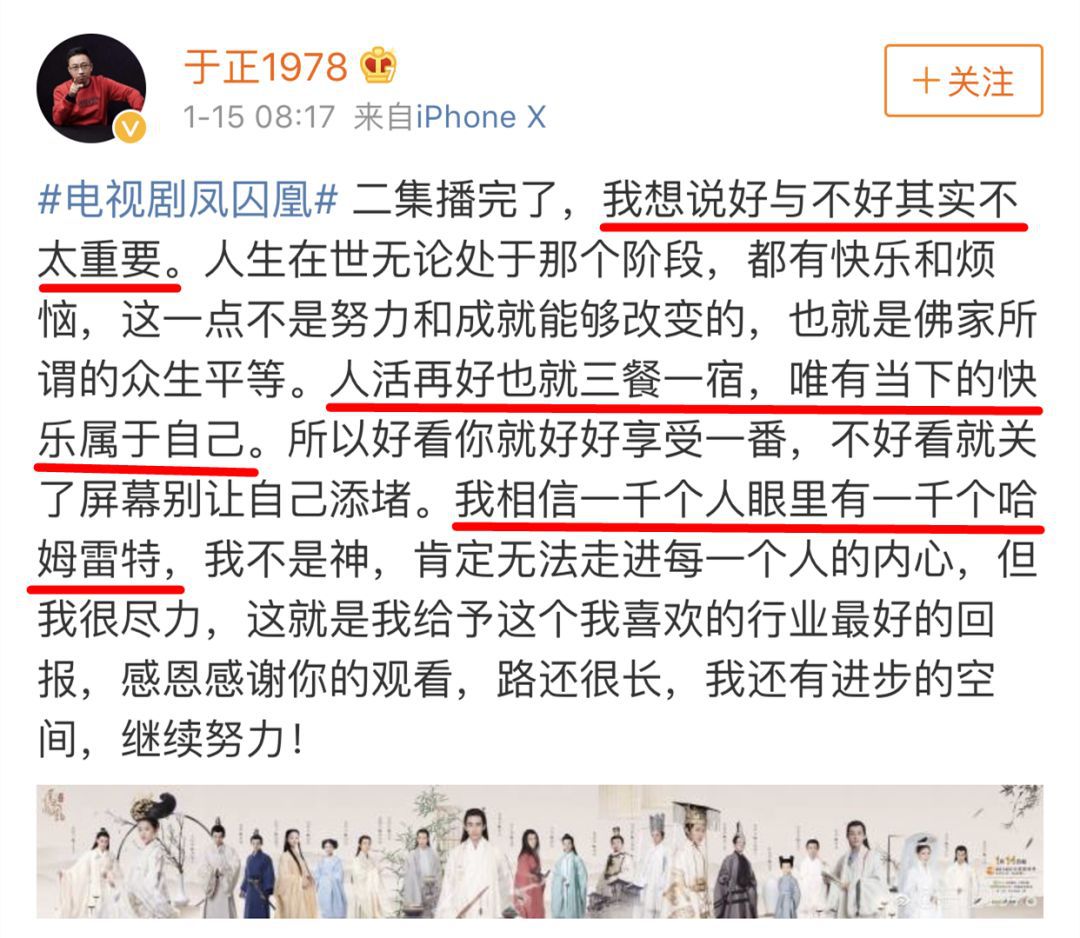 这种情况下,于正自己也坐不住了,亲自站出来为自己解释。1月15日晚于正发出了一个颇具“佛性”的博文,称“我想说好与不好不太重要,人生在世无论处于哪个阶段,都有快乐和烦恼,这一点不是努力和成就能够改变的,也就是佛家所谓的众生平等……”。
