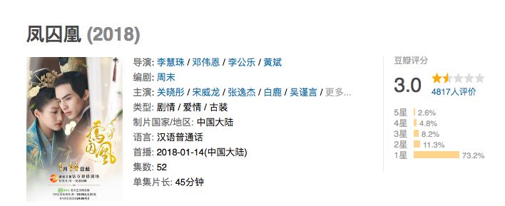 不知道群众的眼睛是雪亮的还是豆瓣上故意黑于正的人多,这部电视剧在豆瓣上,一共有4817人参与了打分,其中高达73.2%的观众直接选择打一星,毫不留情面,导致最后呈现出来的结果就是3分。