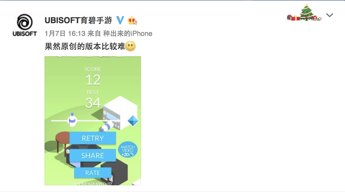 于是有了下面一幕,育碧娱乐软件公司(UBISOFT)成为微信小游戏的首批合作伙伴之一。育碧旗下开趣宝(Ketchapp)也将在微信平台上线数款小游戏。微信如此优秀的传播、社交渠道,育碧怎么能错过!抄袭?不存在的。