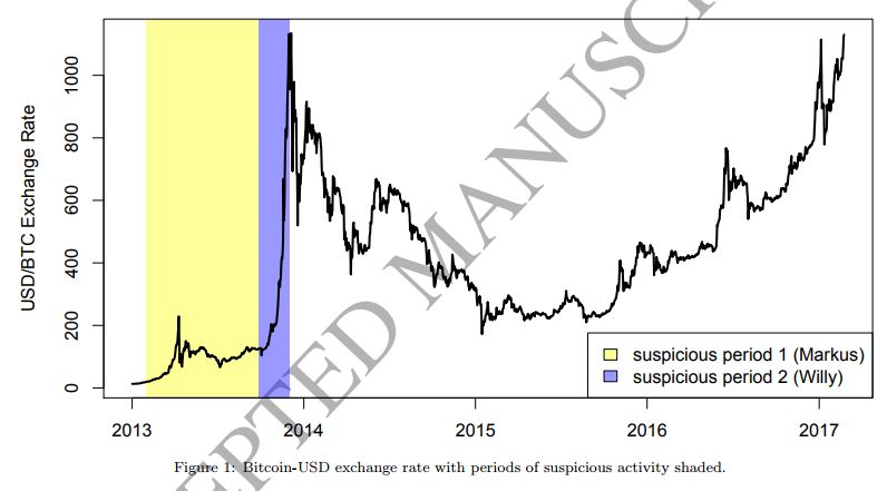 上述研究人员认为,当时比特币价格在两个月内从150美元飙升到1000美元,可能就是这些“可疑交易”操纵价格的结果。