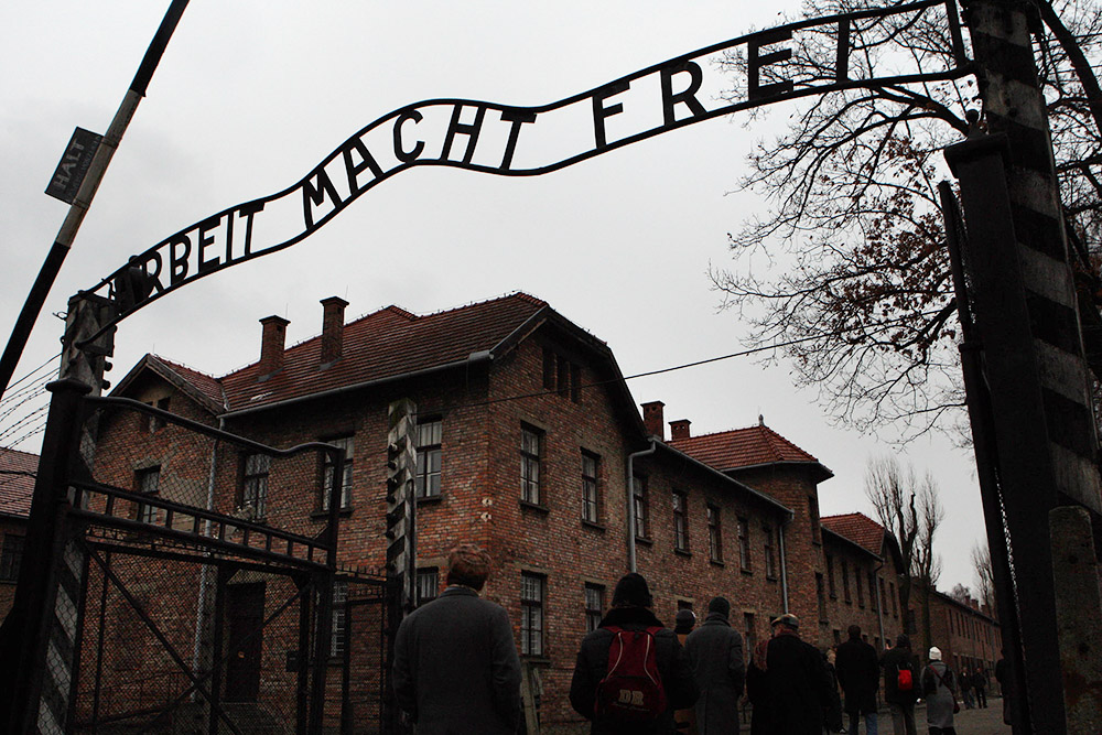 奥斯维辛集中营内波兰语标语“Arbeit macht frei”,意思是“劳动使人自由”。