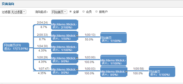 99click商助科技的广告监播页面,可以看到用户来源、浏览轨迹和跳出率等,分析出跳出率高的原因,辅助用户调查,得出比较准确的结论,最后进行产品的优化和改进。