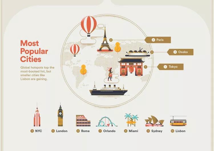 2017年,Airbnb推出“体验(Experiences)”和“攻略(Places)”的新产品,迈出了从短租平台逐步转型到旅游平台的一步,如今平台上也允许酒店专业人士进入,并计划之后逐步融入餐厅和机票预订等第三方服务。这份报告基于Airbnb平台2018上半年的预定数据,并展示了最受欢迎的地方和游客增速最快的地方。报告表示,2018年最受欢迎的三个国际旅游城市是:东京、巴黎和大阪,随后依次为伦敦、罗马、奥兰多、迈阿密、悉尼和里斯本。