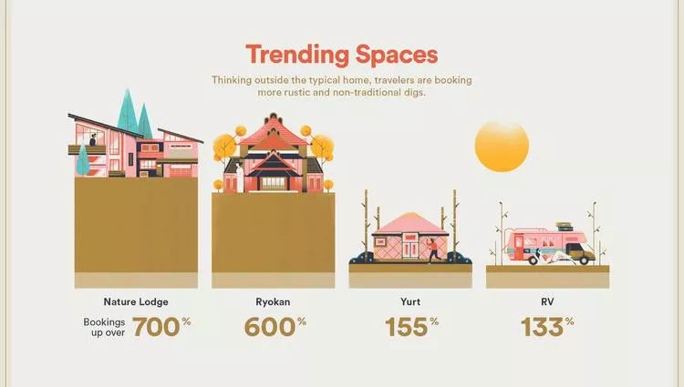 Airbnb报告还揭示了另一个趋势:居住房屋已经成为旅行体验非常重要的一部分,有些人甚至会将其当成旅行目的地。Airbnb上越来越多的人跳出传统的房屋选择——2018年“自然小屋”(即身处自然之中的房屋)的预定量增长超过700%,日式旅馆增长600%,圆顶帐篷和房车也均增长了一倍多。新趋势的诞生,格外凸显了民宿投资的价值。