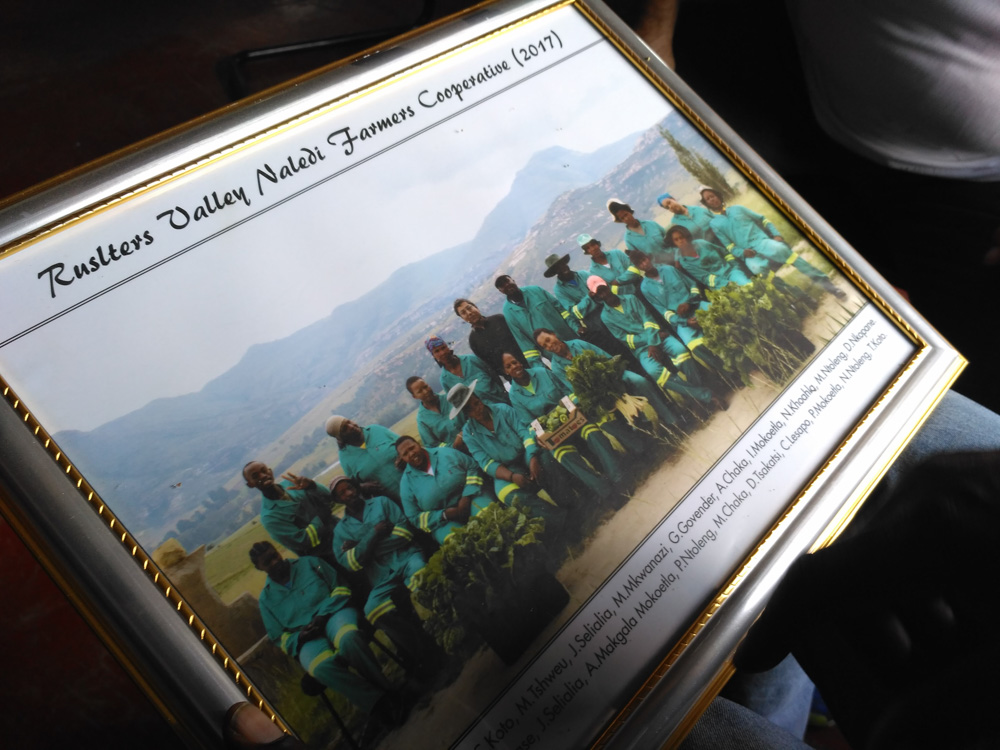 山坡上几栋白墙茅草顶的房子,是杰伊在这里的家,也是地升信托的办公室,巨大的窗子俯瞰着大半个山谷。房子里陈设简朴,没有WIFI。和我们在一起的,是山谷里两个村庄的村长——纳来迪村的安东·查卡(Anton Chaka)和弗兰舒克村的雅匹·莱帕奇(Jappie Lephatsi),常驻山谷参与地升信托工作的杰伊·奈杜的儿子卡米,阿菲利堪白人女士苏西,以及一位从迪拜赶来考察的英国银行业者贾米尔。杰伊、安东和雅匹,一起向我们讲述山谷里的改变和地升信托的抱负。
