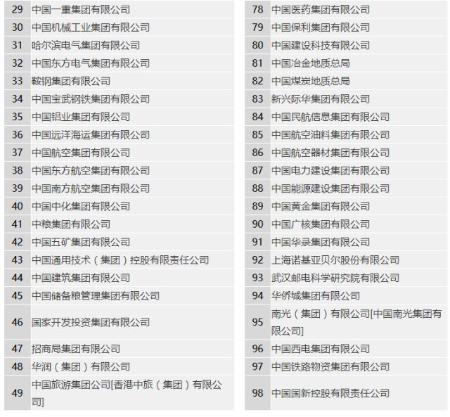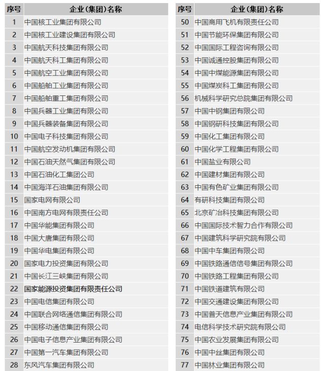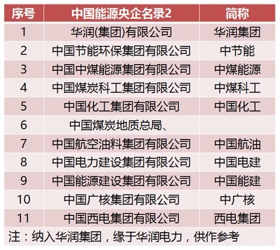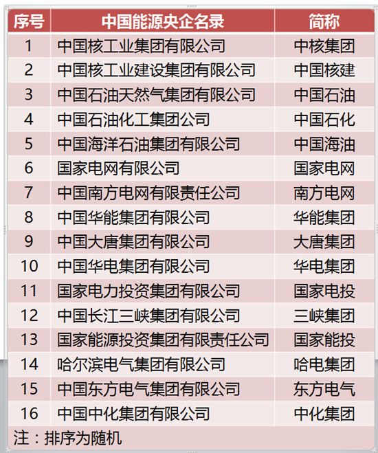 这些央企分别为:中国核工业集团有限公司(简称“中核集团”)、中国核工业建设集团有限公司(简称“中国核建”)、中国石油天然气集团有限公司(简称“中国石油”)、中国石油化工集团公司(简称“中国石化”)、中国海洋石油集团有限公司(简称“中国海油”)、国家电网有限公司(简称“国家电网”)、中国南方电网有限责任公司(简称“南方电网”)、中国华能集团有限公司(简称“华能集团”)、中国大唐集团有限公司(简称“大唐集团”)、中国华电集团有限公司(简称“华电集团”)、国家电力投资集团有限公司(简称“国家电投”)、中国长江三峡集团有限公司(简称“三峡集团”)、国家能源投资集团有限责任公司(简称“国家能投”)、哈尔滨电气集团有限公司(简称“哈电集团”)、中国东方电气集团有限公司(简称“东方电气”)、中国中化集团有限公司(简称“中化集团”)、华润(集团)有限公司(简称“华润集团”)、中国节能环保集团有限公司(简称“中节能”)、中国中煤能源集团有限公司(简称“中煤能源”)、中国煤炭科工集团有限公司(简称“中煤科工”)、中国化工集团有限公司(简称“中国化工”)、中国煤炭地质总局、中国航空油料集团有限公司(简称“中国航油”)、中国电力建设集团有限公司(简称“中国电建”)、中国能源建设集团有限公司(简称“中国能建”)、中国广核集团有限公司(简称“中广核”)和中国西电集团有限公司(简称“西电集团”)。