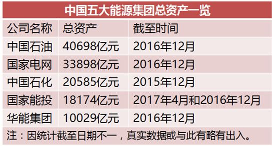 公开数据显示,截至2016年12月,中国石油总资产为40698亿元,实现营收18719亿元,利润总额507.3亿元;截至2015年12月,中国石化资产总额达20,585亿元,营业收入20,473亿元,利税总额3,557亿元; 截至2016年12月,国家电网资产总额33898亿元,实现营收20946亿元,利润866亿元;截至2016年12月,华能集团实现营入2461亿元,利润总额138.8亿元,总资产达到10029亿元;截至2016年12月,华润集团总资产为11000.44亿元,实现营收5034.08亿元,净利润337.82亿元。