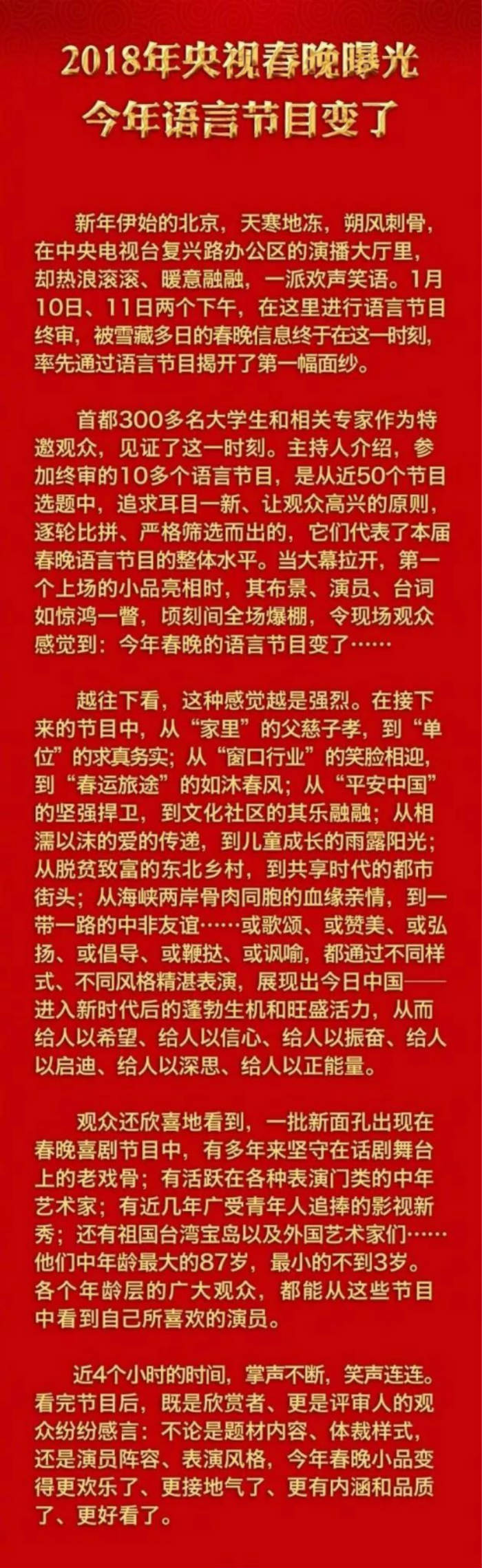 语言类节目一直是观众最为期待也是最受欢迎的节目。1月11日,春晚官方微博发布了一张画风喜庆的长微博,标题简明扼要:今年语言节目变了。从中可以提取出的重点信息有,语言类节目数量增加,可能突破10个;跨界表演增加;大力弘扬主旋律。