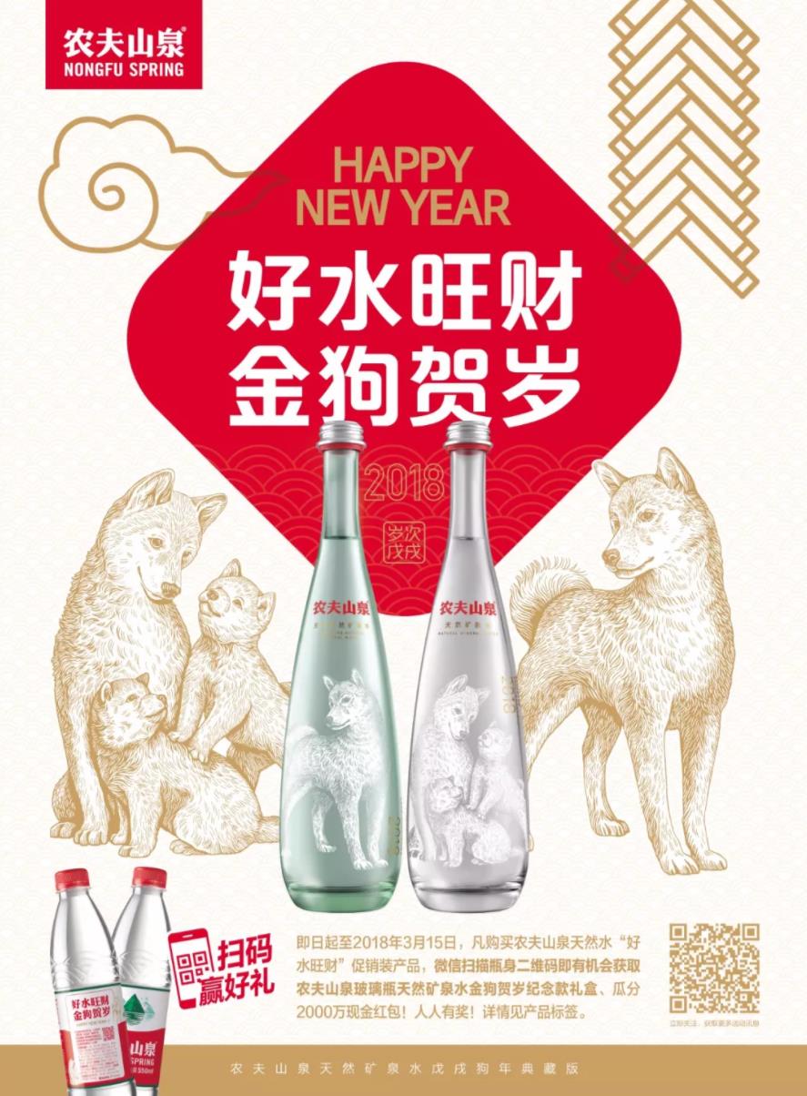 这已经是农夫山泉高端水推出的第三个年头了,今年,他们推出了狗年贺岁装的高端瓶装水。其中含气矿泉水的图案是一只雄性田园犬,而不含气矿泉水的图案,则是一只狗妈妈,带着两只狗宝宝。和过去一样,这款纪念装高端水也只在微信抽取,并不对外出售。