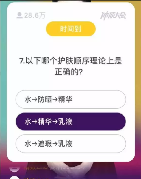 比如这道关于护肤流程的题,如果跟你连麦的人里有个正在敷面膜熬夜的精致女孩,那你可能会从耳机里听到一个妹子尽量保持面部不动发出的模糊声音:第二个,第二个!