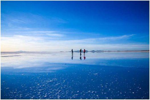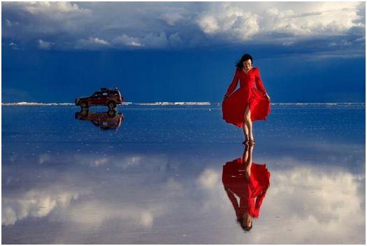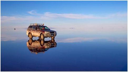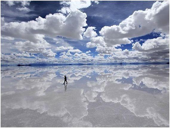 这里的盐沼地含有超过100亿吨的盐分,大部分时间处于干涸状态,地表龟裂。而在每年12月至来年3月的雨季时分,地表上的雨水将整个盐湖覆盖,变成光滑的镜面,天空和地面的分界线难以辨别,行走其上如同漫步天际——天空之镜由此得名。