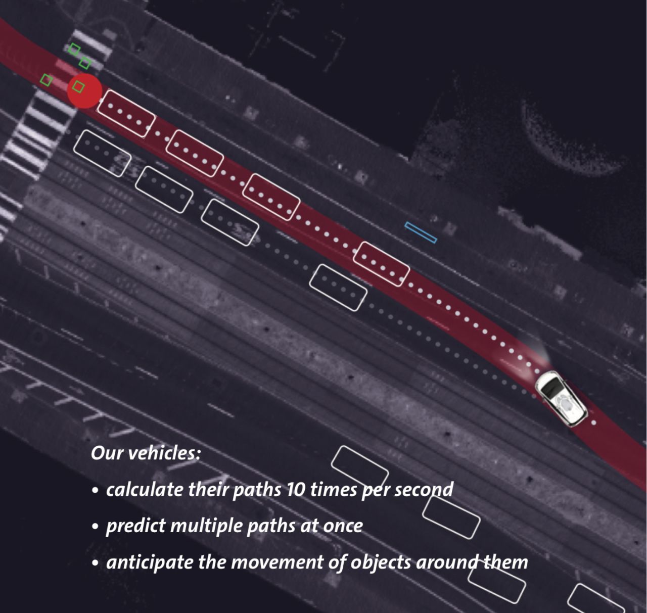 Cruise自动驾驶汽车会以每秒10次的运算速度计算行驶路径;同时一次预测多条路径,并不断选择最好的一条来满足不断变化的道路状况及突发事件,此外还可以预测周围物体的移动。