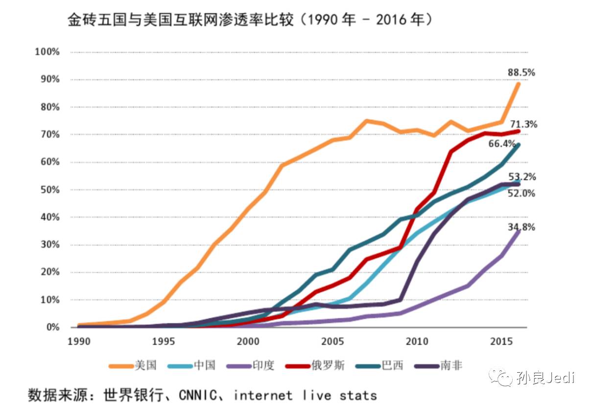 通过世界银行、CNNIC、internet live stats综合数据来看,2016年南非与中国网民普及率相近,都在52%左右。而从发展曲线来看,与俄罗斯相似,都是在2009年前后开始呈现指数级增长。南非的关键事件在于2010年的世界杯。在其前一年,中兴、华为等中国通信设备商全面助力南非通信基础设施的升级。