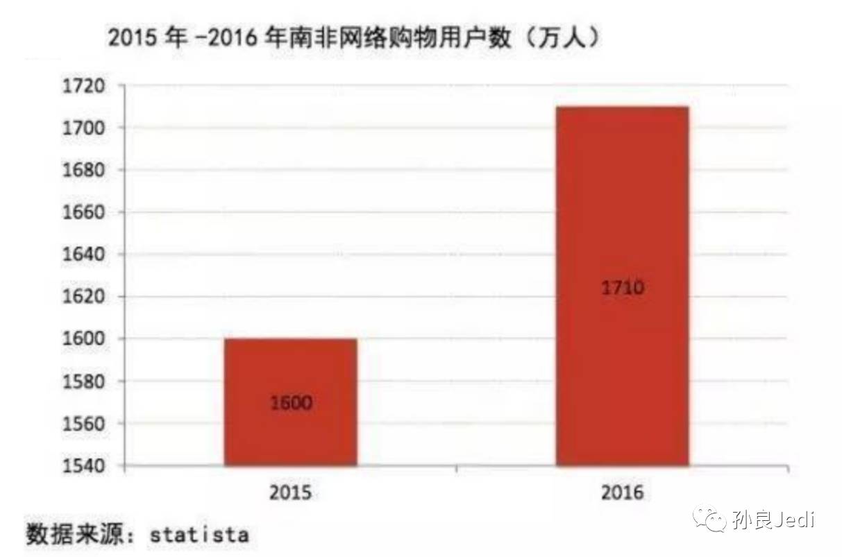南非电商起步晚,但发展快,网购用户1710万,仅次于尼日利亚,排在非洲第二位,网购使用率59.8%。2016年南非网络零售规模达23.3亿美元,较2015年同比增长14.2%