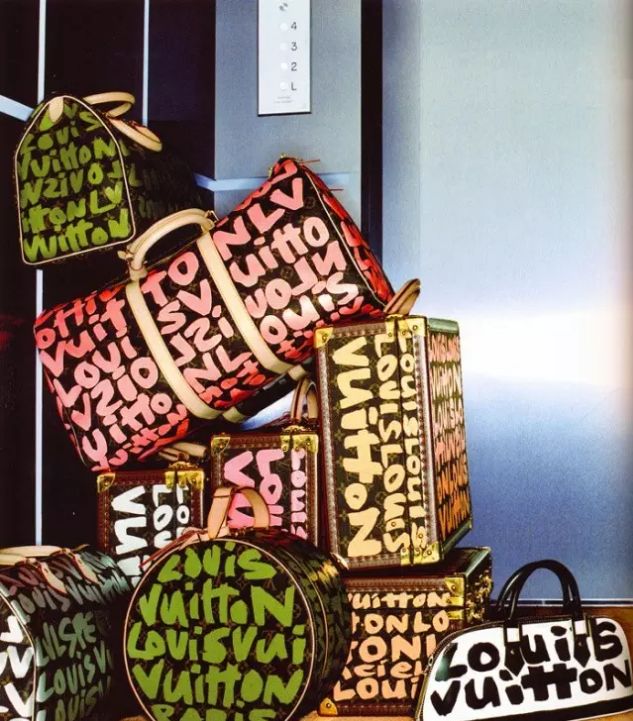用这张图不是没有原因的,这是作为创意总监的 “小马哥” 让 LV 变得开始浮夸的一个重大改革:2001 年,“小马哥” 邀请设计师兼艺术家 Stephen Sprouse 创造了一系列 “涂鸦” 包,撼动业界 。据传,虽说是艺术合作,但当时品牌态度依旧坚决,不肯走下神坛。“小马哥” 最后自掏腰包,才让品牌接受涂鸦改造。
