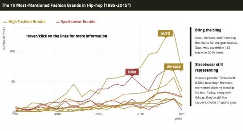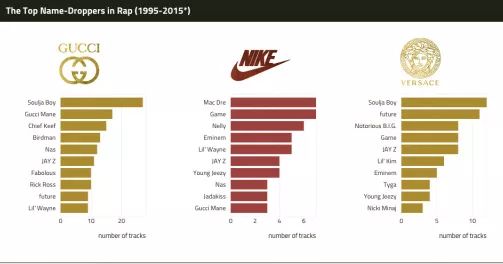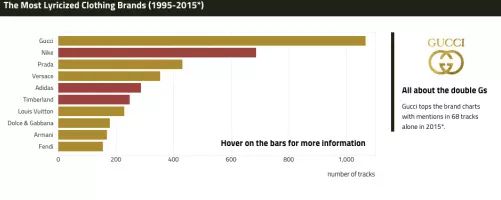 根据媒体 Highsnobiety 的不完全统计,“Gucci 的使用率要比任何品牌要高,成为饶舌歌手们最爱用的品牌。”来,看图数据说话。