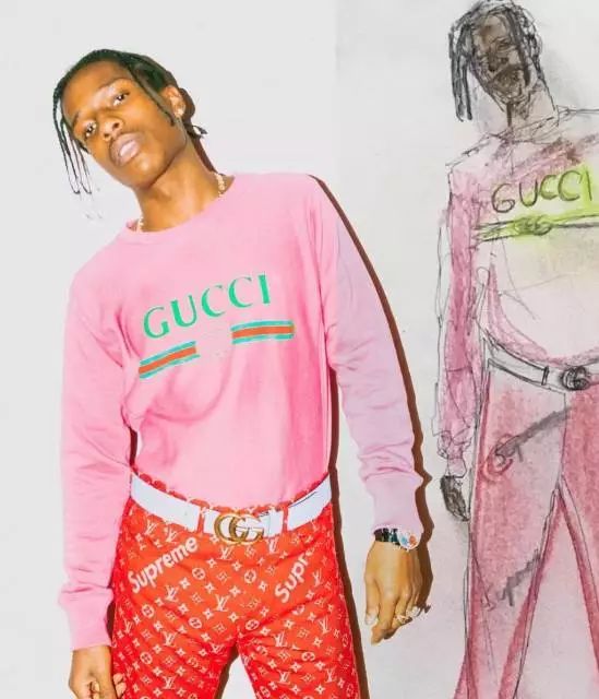 而是 Gucci!!其实 Gucci 和 嘻哈的渊源也不小,将高级时装引入嘻哈文化的鼻祖 Dapper Dan,以为当红嘻哈歌手设计“高级山寨货”闻名,1980年代的时候,他就很喜欢从 Gucci 身上“找灵感” 。