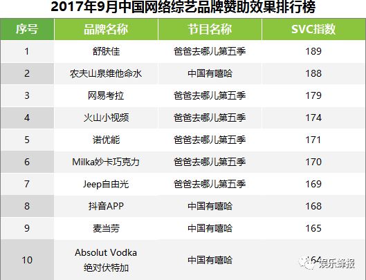 据艾瑞发布的2017年Q3中国网络综艺赞助效果数据显示,爸5播出首月,赞助品牌效果指数就超过了之前一直领先的《中国有嘻哈》。