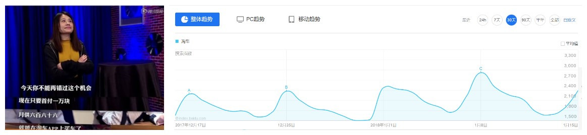 节目播出后,知名度略低的淘车APP的宣传效果就很明显了。百度指数在每期节目播出后增长迅速。