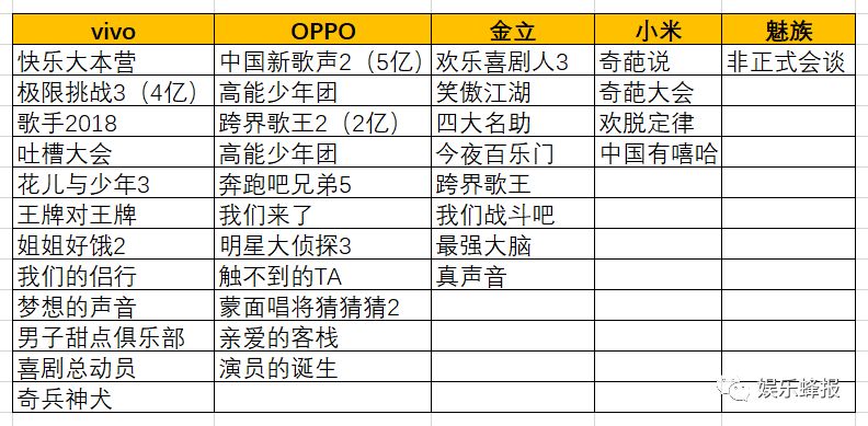 过去的一年,手机又领衔了综艺市场的冠名榜单,vivo、OPPO冠名的节目最多,初步估算光冠名费应该就至少有20亿了。面对OPPO、vivo的强势围攻,连一直坚持“口碑第一”的小米也加入到了冠名赞助的行列。