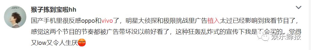 蜂蜂私认为,这位微博网友的观点还是很有代表性的,现在铺天盖地的手机植入广告,确实给观众造成了困扰,广告打得越多,也就越容易混淆产品特色。「我愿意去看奇葩说,但我不会穿美特斯邦威」这样的人应该大有人在。