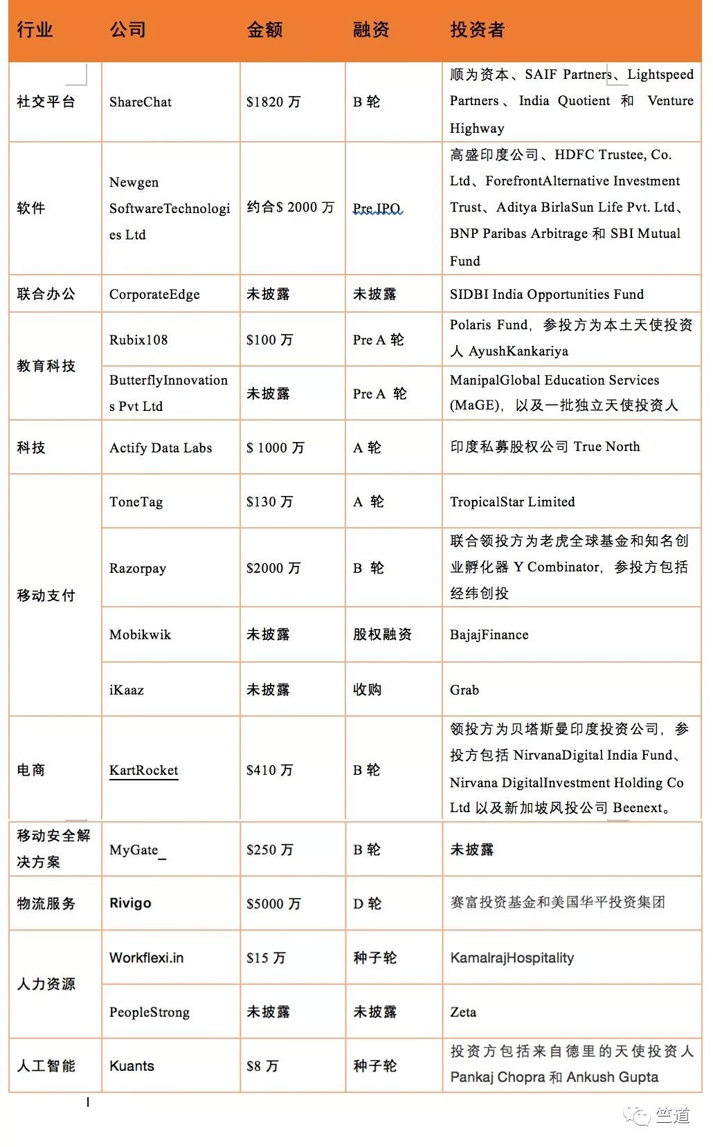 本周共有16笔交易,共计交易额达1.2733亿美元。本周移动支付交易数量最多,共有四笔交易,其中数字支付初创公司iKaaz被东南亚共享驾乘巨头Grab收购;小米及顺为资本投资社交平台ShareChat最值得关注,小米继续加码印度市场。教育科技及人力资源领域也值得关注,获得多笔投资。