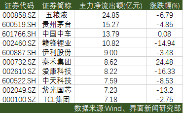 在本周连续五个交易日遭遇主力净流出的个股中,132只个股累计净流出额超过1亿元。这其中,17只个股累计净流出额超过5亿元。五粮液(000858.SZ)、贵州茅台(600519.SH)、中国中车(601766.SH)主力资金累计净流出额居前,分别为24.85亿元、15.27亿元、13.79亿元。
