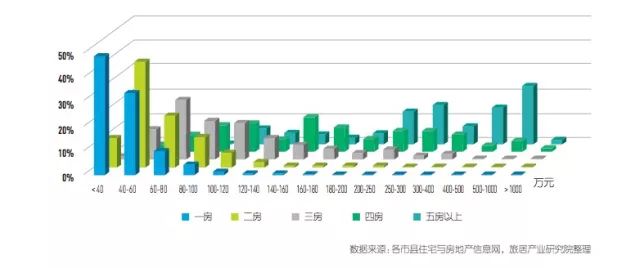 成交户型中,一居室总价集中在 60 万以内的接近 80%,40 万以内占比最高;二居总价集中 在 100 万以内,以 40-60 万占比最高。