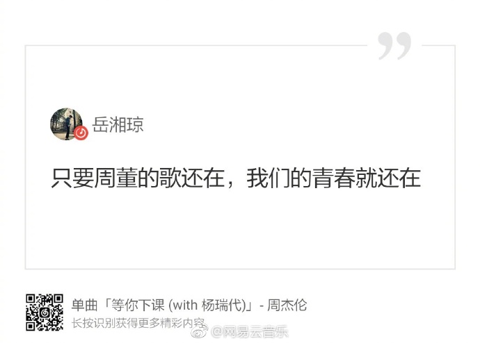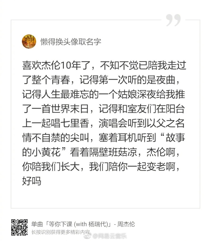 现象级的社交网络刷屏证明了他的国民度。无数人缅怀青春的同时,另外一首15年前的老歌还创下了华语音乐的新纪录——出自2003年专辑《叶惠美》的《晴天》,在网易云音乐上的评论于18号傍晚超过了203万条,超出了第二名《雅俗共赏》近2倍。