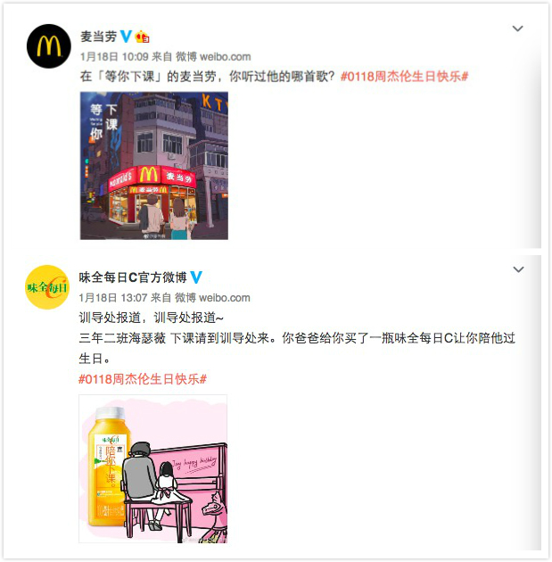 网易云音乐上这首新歌的评论数量在24小时内迅速突破了32万。#0118周杰伦生日快乐#的话题迅速登上微博热搜,淘宝、ofo小黄车、味全每日C、麦当劳和旺仔等一大批活跃的品牌,更是把这个话题变成了当天的社交网络热点狂欢。