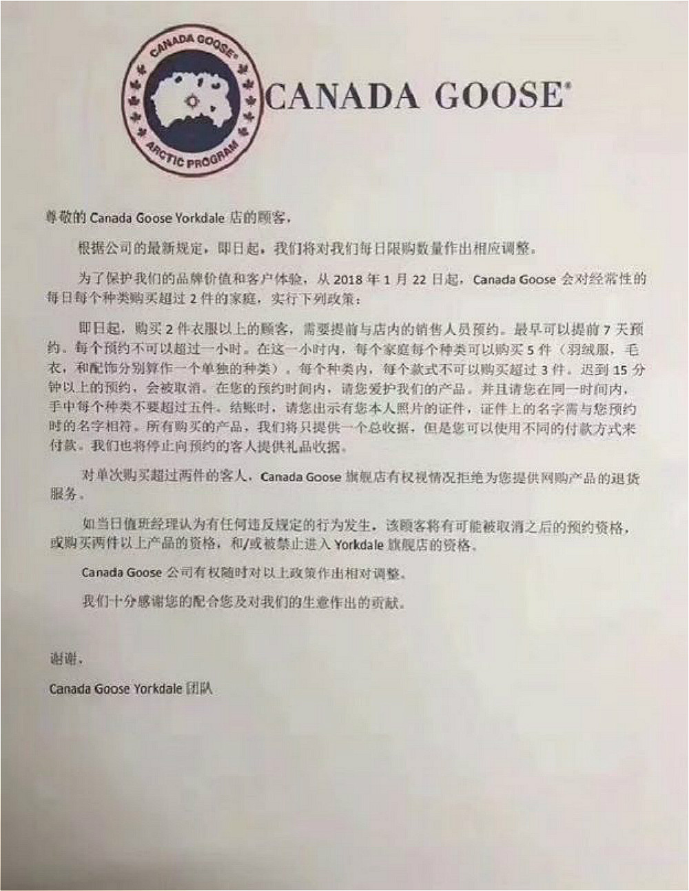 近日,一份流传于朋友圈的“加拿大鹅(Cananda Goose)新政策”火了。图片显示在加拿大鹅位于多伦多Yorkdale商场门店内,公司将对每日限购数量做出调整: