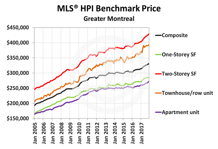图二:蒙特利尔MLS®房屋基淮价格(2005年1月—2017年12月)
