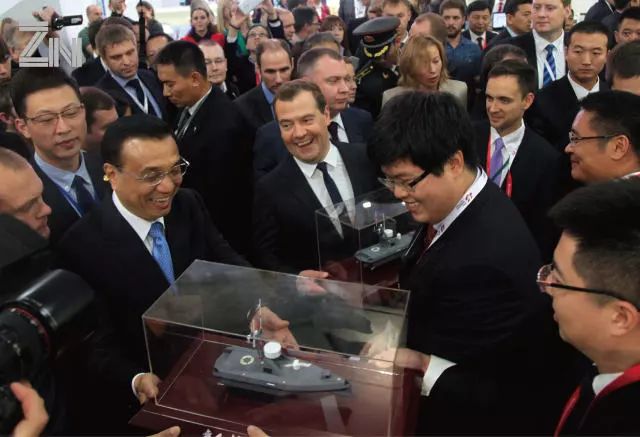 2014年张云飞在莫斯科向中俄两国总理介绍无人船