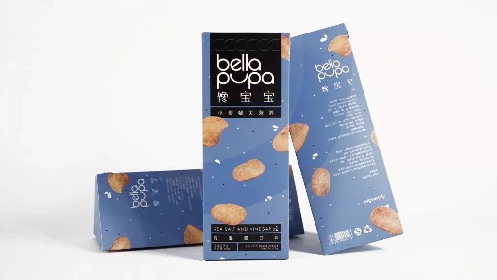 Bella Pupa馋宝宝是由26%的蚕粉制成的零食小食,外貌呈现出薯片状,是由连续创业者Massimo Reverberi和一个由中、法食物设计师、食物科学家组成的团队共同创造的国内首款食用昆虫产品。