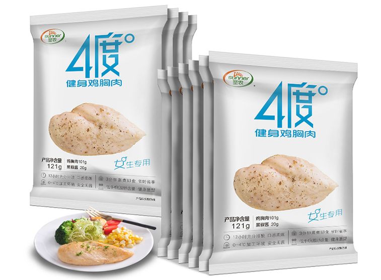 圣农推出的这款鸡胸肉专为健身人群所设计,并走高端产品路线,所采用的原材料选自生态农场,肉品要求低于4%脂肪含量。为了解决以往鸡胸肉口感干、柴的问题,圣农采用了50-60°热水喷淋浸烫脱毛技术,12小时排酸工艺,手工去除结缔组织,并且在0-4℃环境下加工,保证了鸡胸肉鲜嫩。此外,圣农还是一款性别差异型食品,由于在健身市场男女需求的不一样,将产品分为黑色包装169g的男款和白色包装121g的女款,贴心的设计体现出对消费者的关怀,也提高了用户的消费体验。
