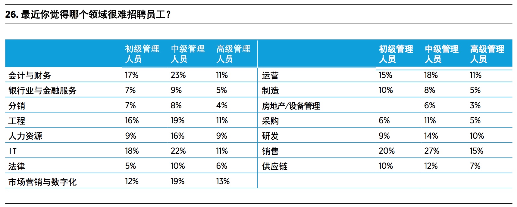 报告显示,在中国大陆,雇主们认为最难招聘的5种岗位是中层研发管理岗位、中层销售管理岗位、中层工程管理岗位、中层市场管理岗位和中层运营管理岗位。兰熙蒙表示,中层管理人才缺乏的现象在科技行业尤其明显,这和该行业快速发展、从业人员普遍年纪较轻、缺乏管理经验有关。