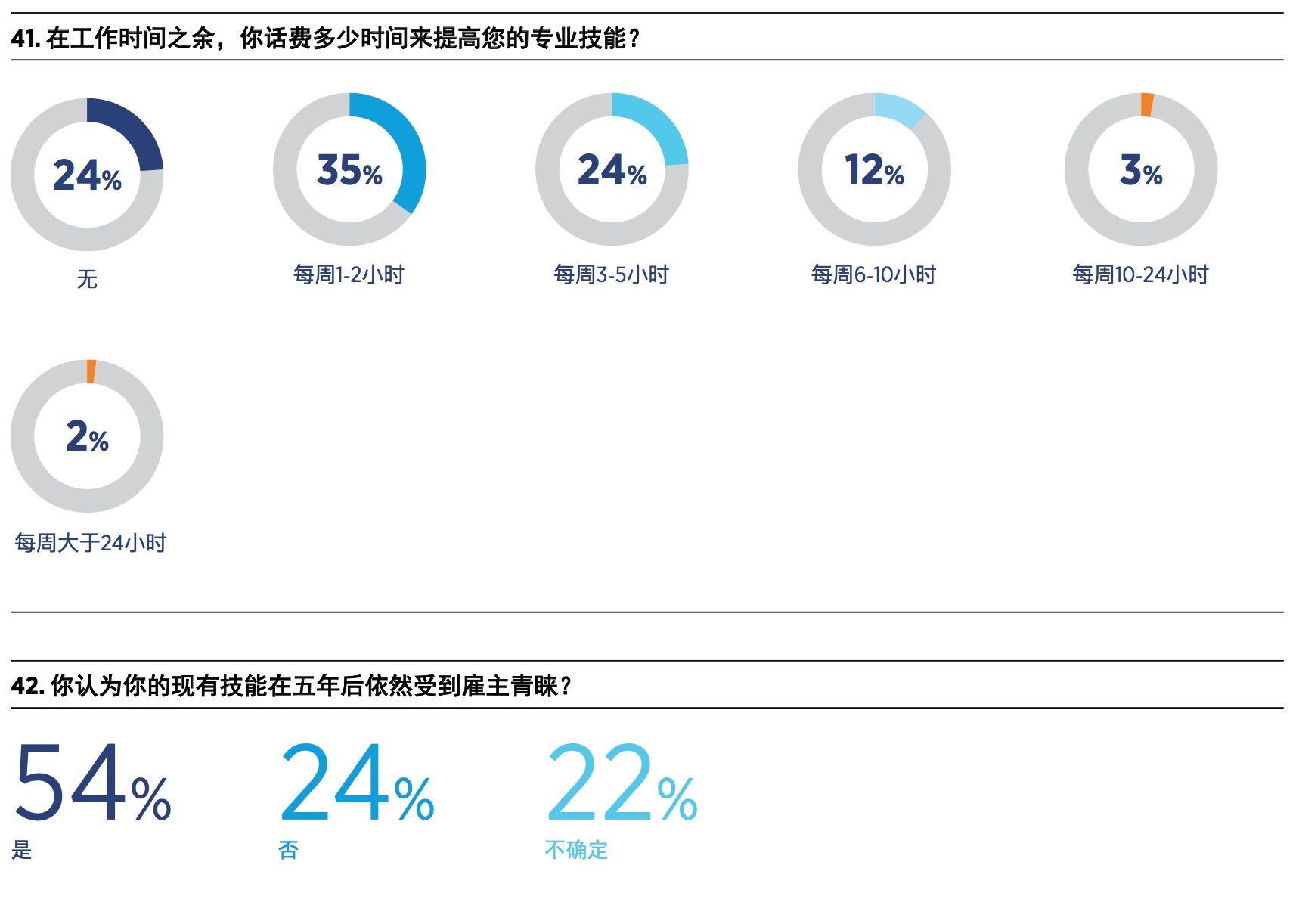 值得注意的是,中国大陆只有53%的员工相信他们现在具备的技能在5年后仍是雇主需要的,该比例高于中国香港(48%)和日本(33%),但低于马来西亚(67%)。在亚洲范围内,35%的受访员工每周花1-2个小时用来提高专业技能,24%的受访员工每周花3-5个小时来提高专业技能,17%的受访员工每周花6个小时以上用来提高专业技能。