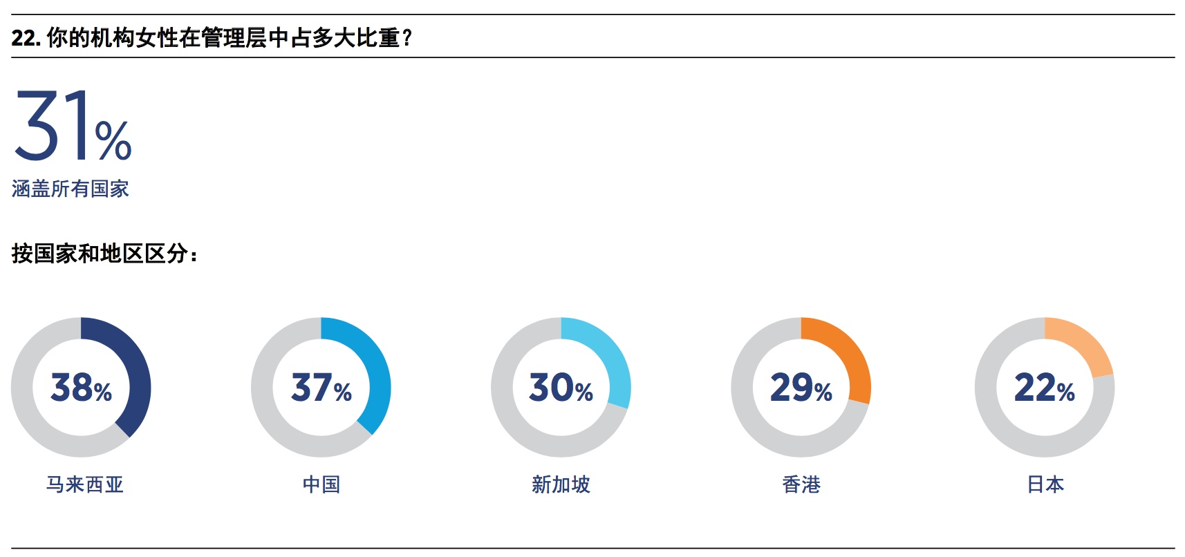 在管理层性别多样性方面,中国大陆地区雇主管理层女性的数量比例较上年增长了2%,达到37%,仅次于排名第一的马来西亚(38%),日本在该方面垫底,仅有22%的女性担任管理岗位。兰熙蒙认为,中国女性领导力的增强与过去5年新兴行业——特别是服务业——及新兴就业岗位不断涌现密切相关,“这让雇主更在意员工能力是否达到需求,而不是员工的性别”。
