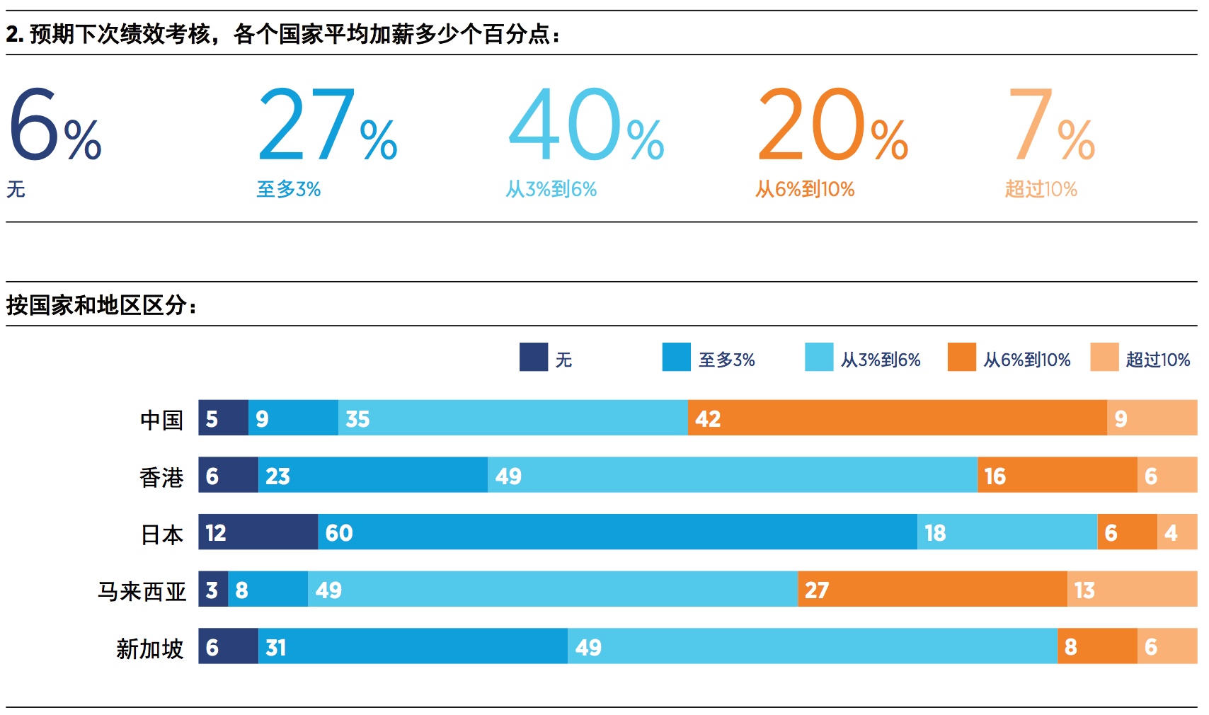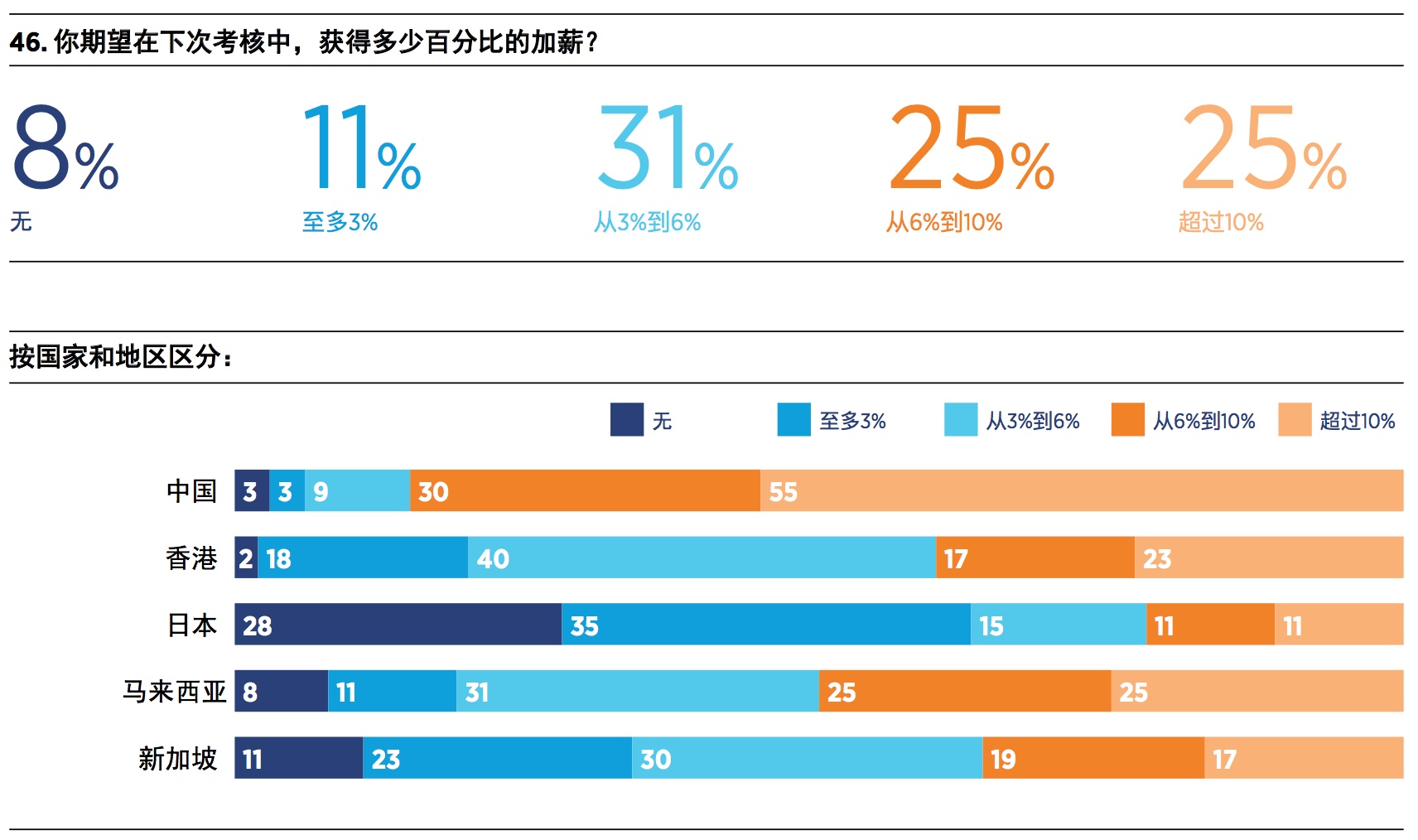 尽管如此,2018年51%的中国大陆雇主计划涨薪6%以上,比亚洲整体水平高出24%,令中国大陆成为亚太地区涨薪幅度最大的地区。另外,有35%的中国大陆雇主计划通过涨薪3%至6%来留住人才。然而85%的中国大陆员工期待涨薪6%以上,其中希望涨薪幅度达到10%以上的员工达55%。在亚太地区,涨薪幅度最小的地区为日本(0%-3%),中国香港、马来西亚和新加坡的涨薪幅度集中于3%-6%。